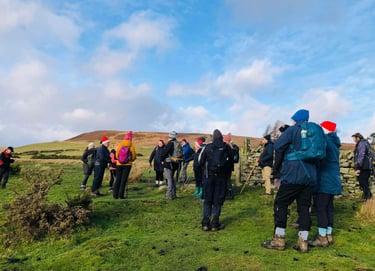 Another great walk with fabulous company as 39 walkers joined Wolsingham Wayfarers for our November free guided walk and navigated a bit of soggy ground around Black Banks and Knitsley Fell. As far as I remember it, we didn’t get lost once, and there were no underwater stiles. We even enjoyed a picnic in a crater! Join us in December for our traditional Christmas walk, enjoying mulled wine and mince pies under the Christmas Trees